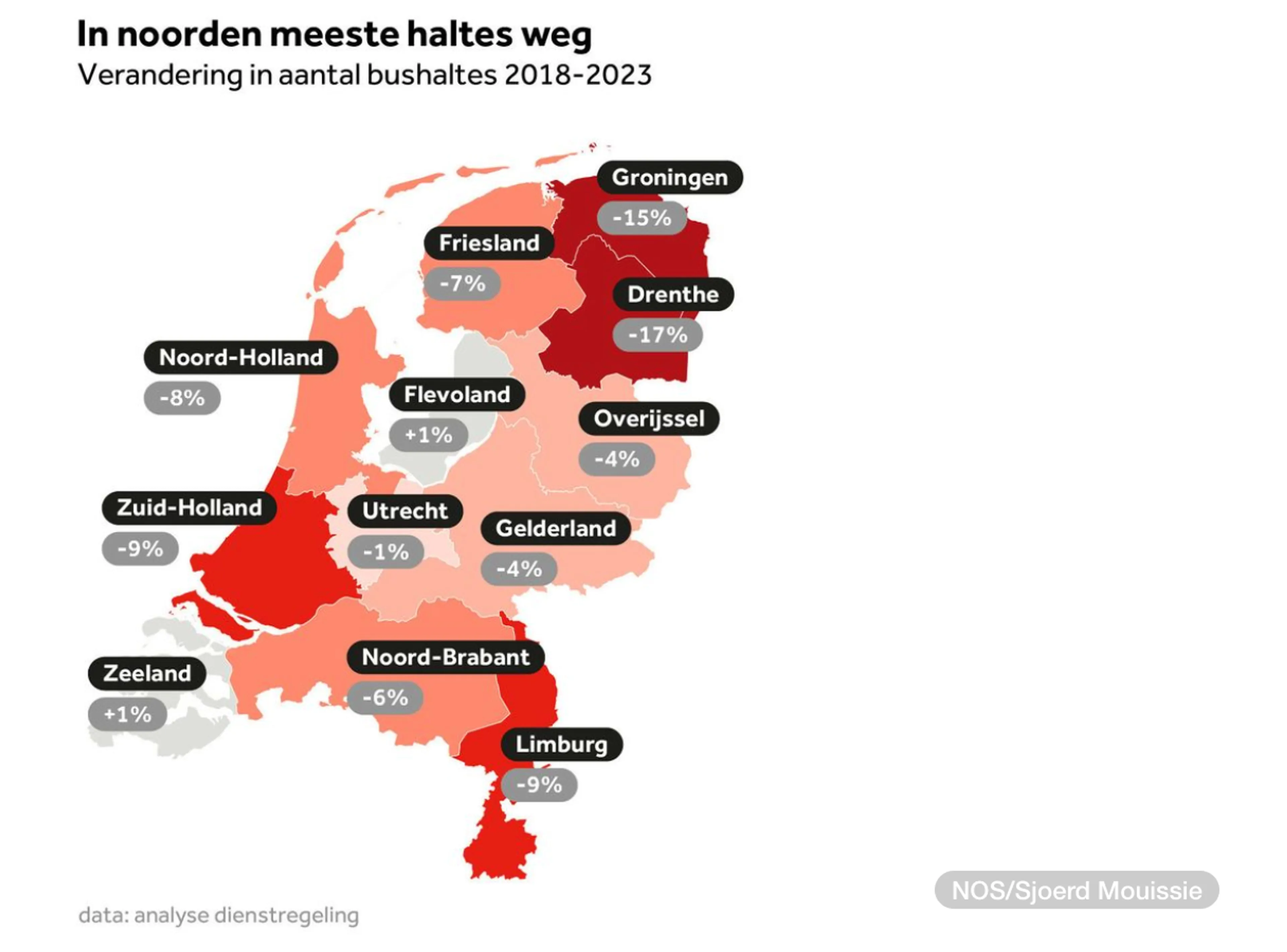 In Drenthe (daling van 17%) en Groningen (daling van 15%) nam het aantal haltes het sterkst af. In Zeeland (stijging van 1%) en Flevoland (stijging van 1%) kwamen er juist haltes bij. Toch betekent het niet dat alle inwoners van Zeeland en Flevoland makkelijk de bus kunnen nemen. Wáár de bushaltes zijn, speelt ook een belangrijke rol.