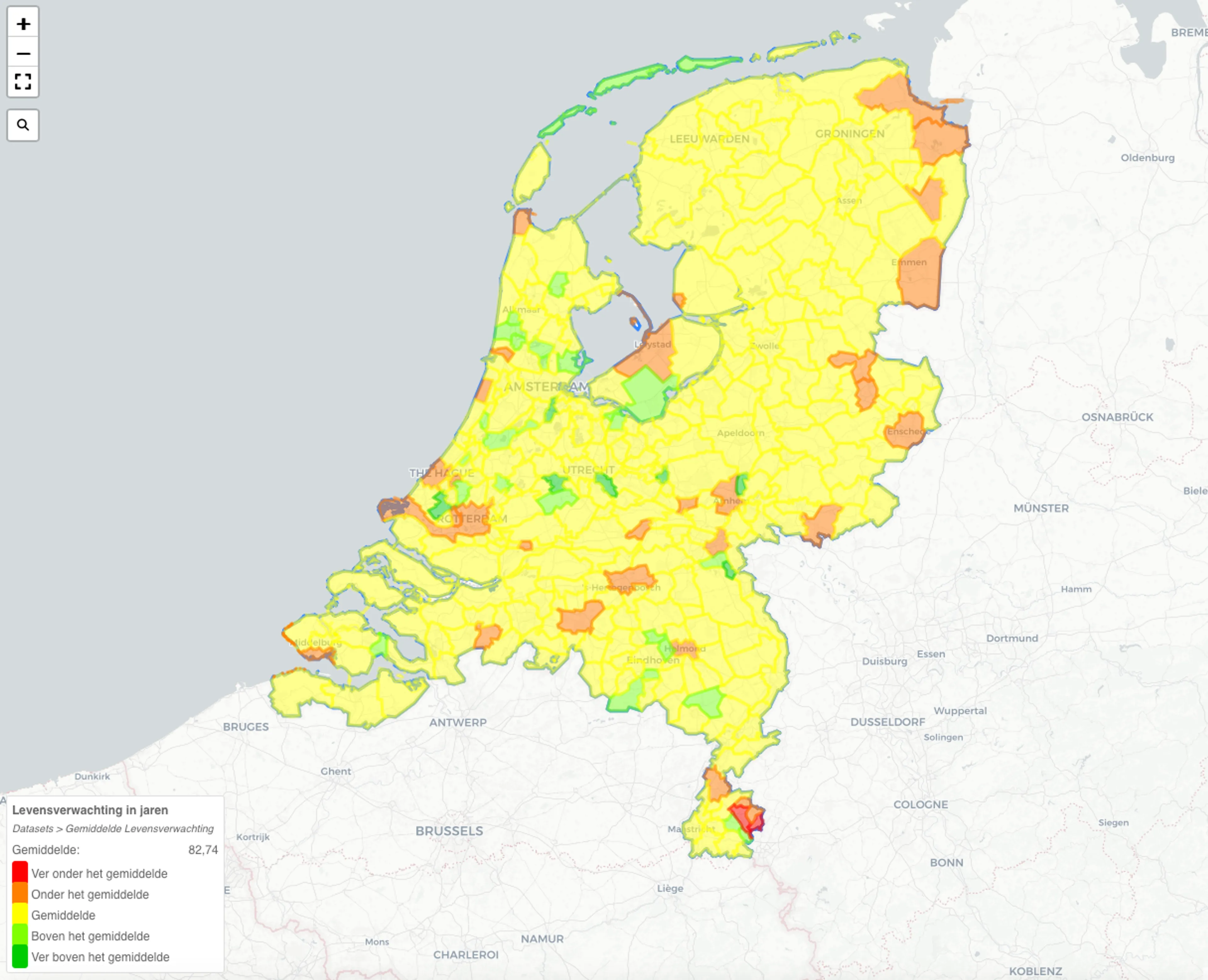 De levensverwachting in Nederland was in de periode 2019-2022 81,6 jaar. Mannen hadden een levensverwachting van 79,9 jaar, vrouwen werden naar verwachting drie jaar ouder: 83,1 jaar. In de regio Hollands-Midden - hieronder vallen onder andere de gemeenten Gouda, Krimpenerwaard en Zuidplas - is de levensverwachting het hoogst, in Zuid-Limburg het laagst. Ook hier zie je dat gemeenten met een hogere levensverwachting vooral in het westen van Nederland te vinden zijn. In het noorden van het land en in de grotere steden is de levensverwachting over het algemeen lager. Het Gelderse Rozendaal heeft met 89,2 jaar de hoogste levensverwachting van Nederland. De laagste levensverwachting heeft Kerkrade in Zuid-Limburg: 78,1 jaar.