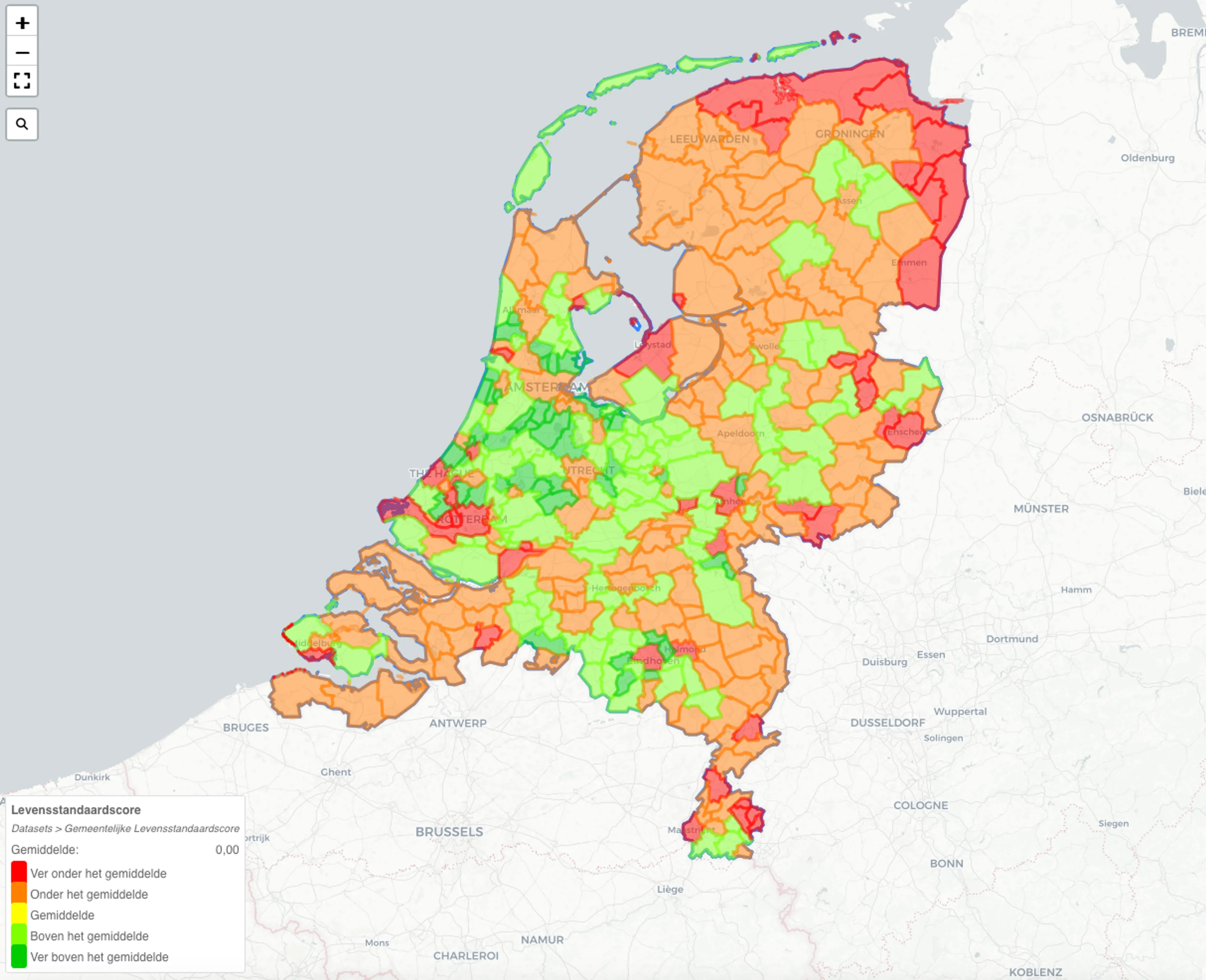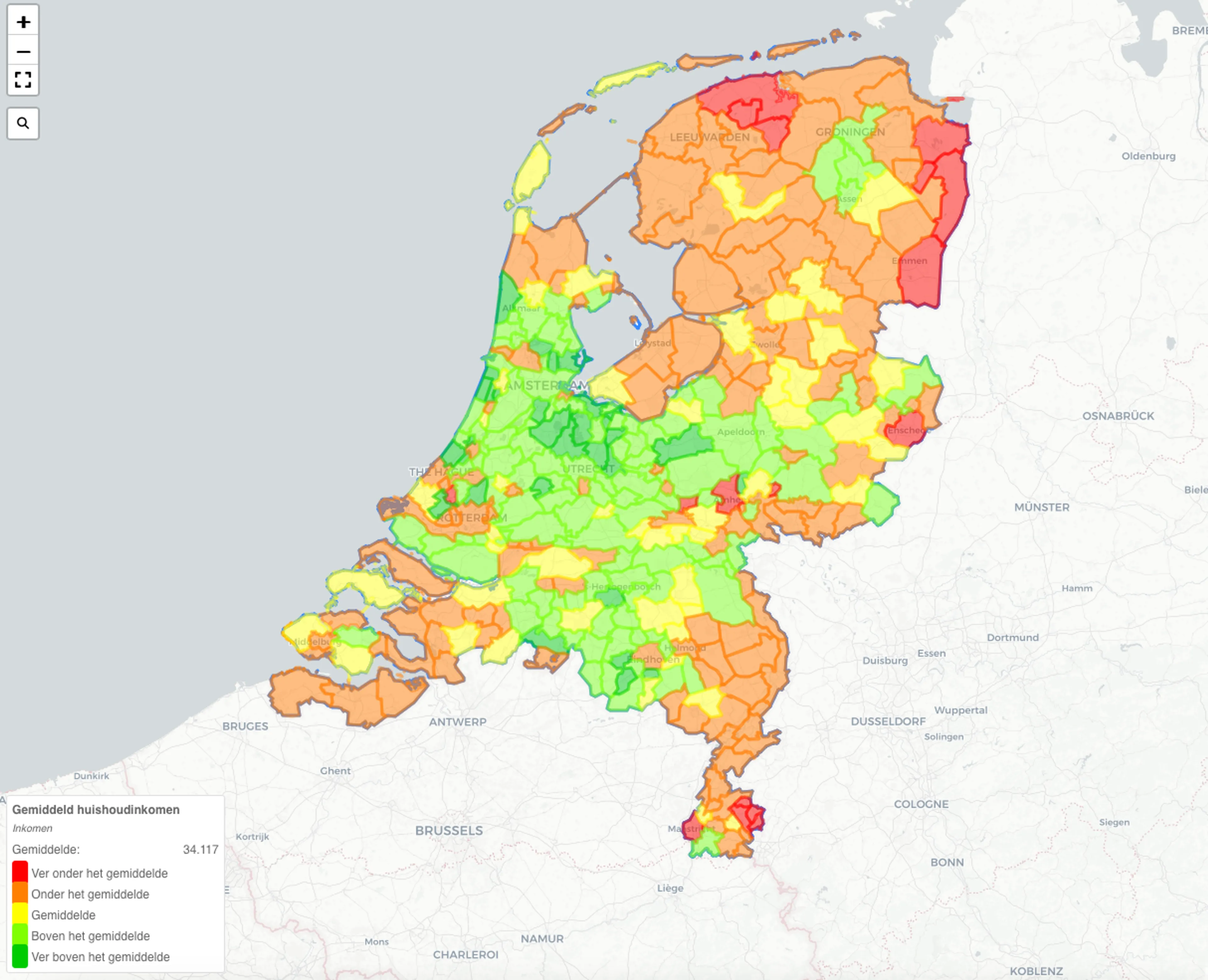 Het gestandaardiseerd inkomen - ook wel koopkracht genoemd - van Nederlandse huishoudens was 35,4 duizend euro in 2022. De tien gemeenten waar huishoudens de hoogste inkomens hebben, liggen bijna allemaal in het westen van het land. Bloemendaal staat op de eerste plek met een gemiddeld inkomen van 74,3 duizend euro. Dat is ruim twee keer zoveel als het landelijk gemiddelde.