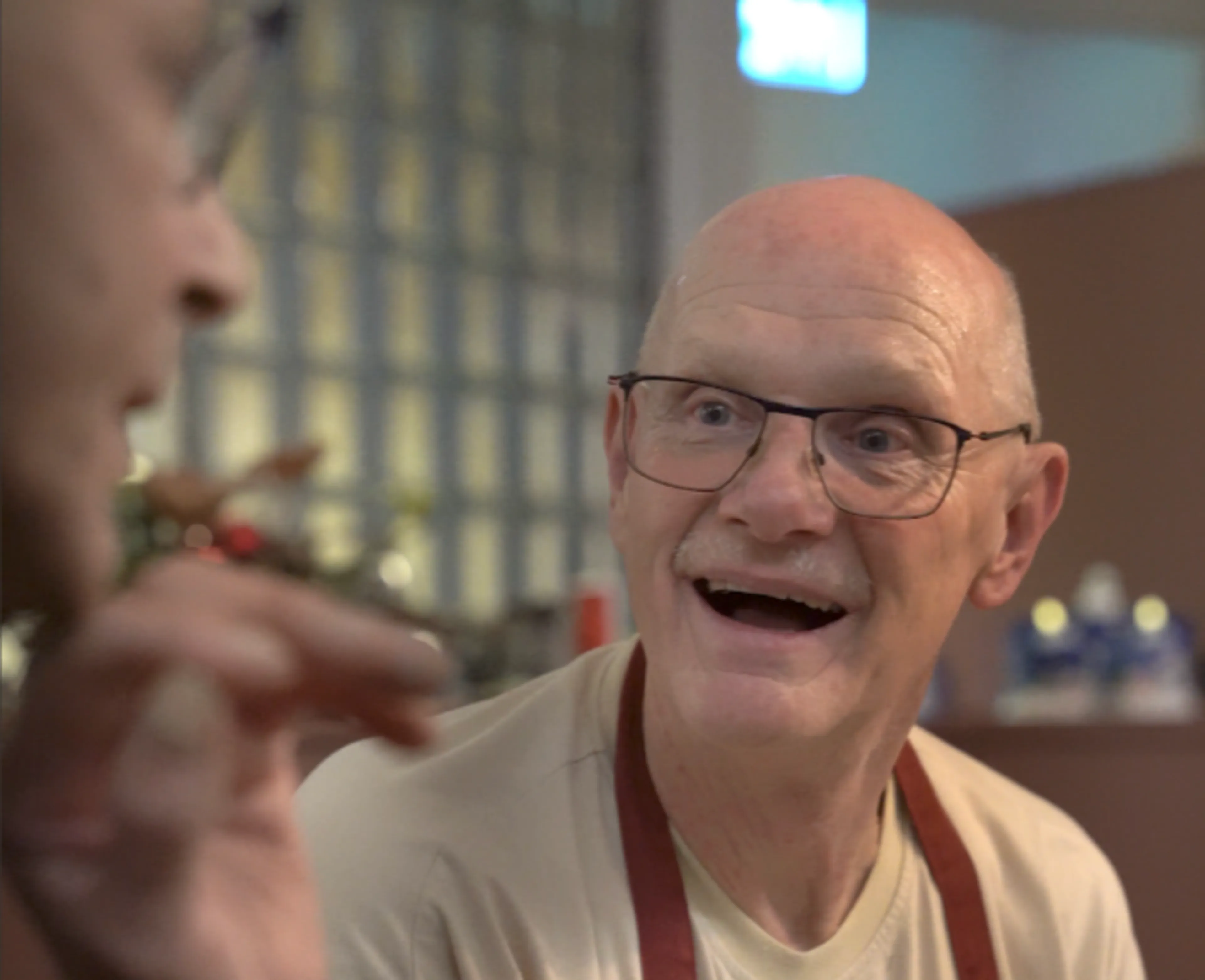 Aan tafel klinken bestek en zachte stemmen door elkaar. De sfeer is rustig en ongedwongen, bijna alledaags. Het lijkt even alsof het gewone leven doorgaat. John zit aan tafel, luistert en eet mee. "Het leven is nu", zei hij eerder. In deze keuken en aan deze tafel laat John dat elke week opnieuw zien met aandacht en zorg.