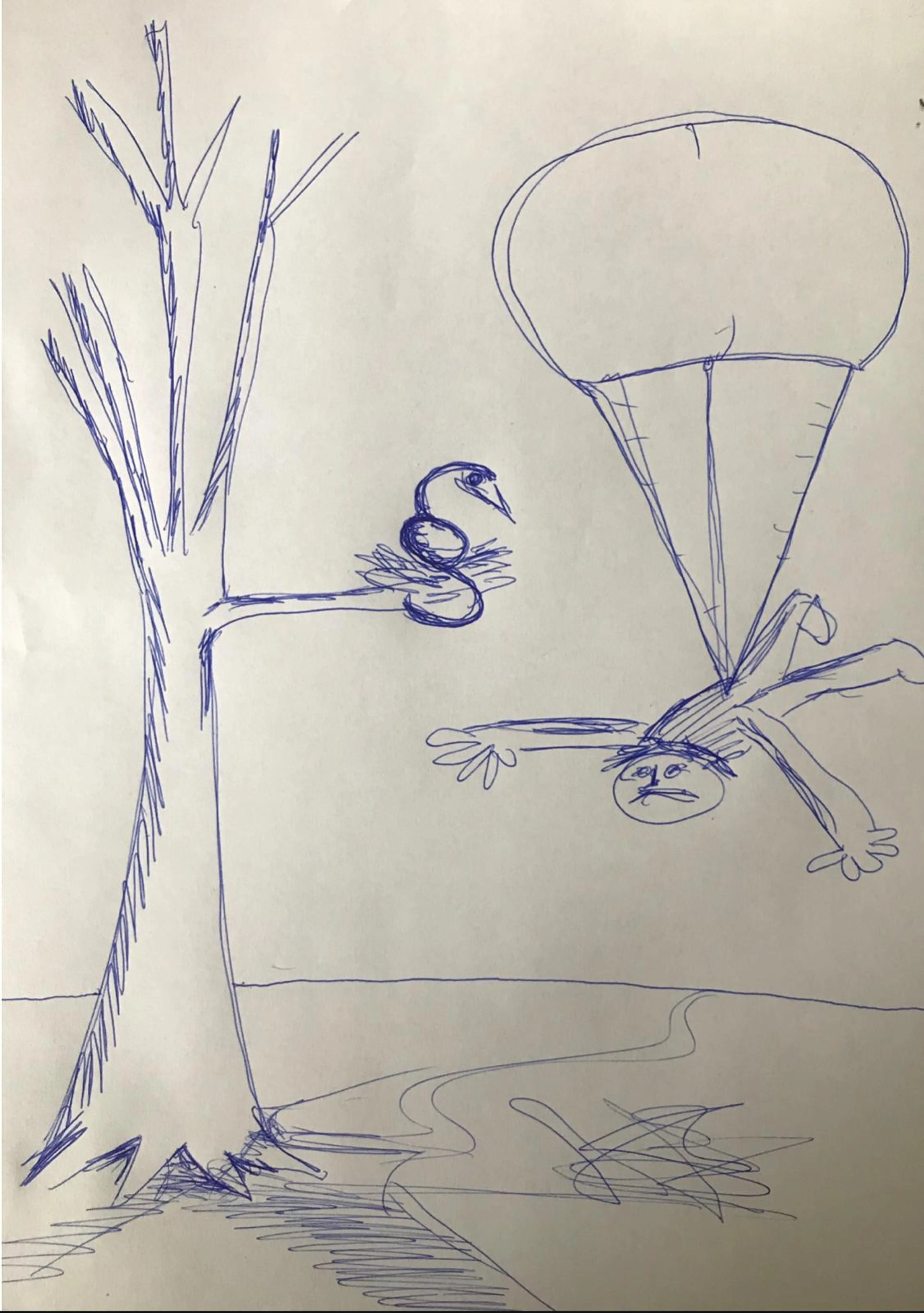 “In die psychose kreeg ik een beeld dat ik op papier uittekende. Op school liet ik mijn tekening zien aan de conrector. Die tekening toonde voor mijn gevoel heel duidelijk dat mijn vader hulp nodig had. Ik had namelijk allemaal dingen getekend die beginnen met 'PA', daar associeerde ik dus mee. Ik had een boom getekend met een nestje in de vorm van een paragraaf met een vogel erin. Naast de boom hing een parachute, die eruitzag als een ijsje, met daaraan mijn pa, die duidelijk neer ging storten. De conrector snapte niet wat mijn vraag of intentie met dit beeld was, dus hij pikte niet op dat ik met die tekening eigenlijk om hulp vroeg in mijn psychotische waan.”
