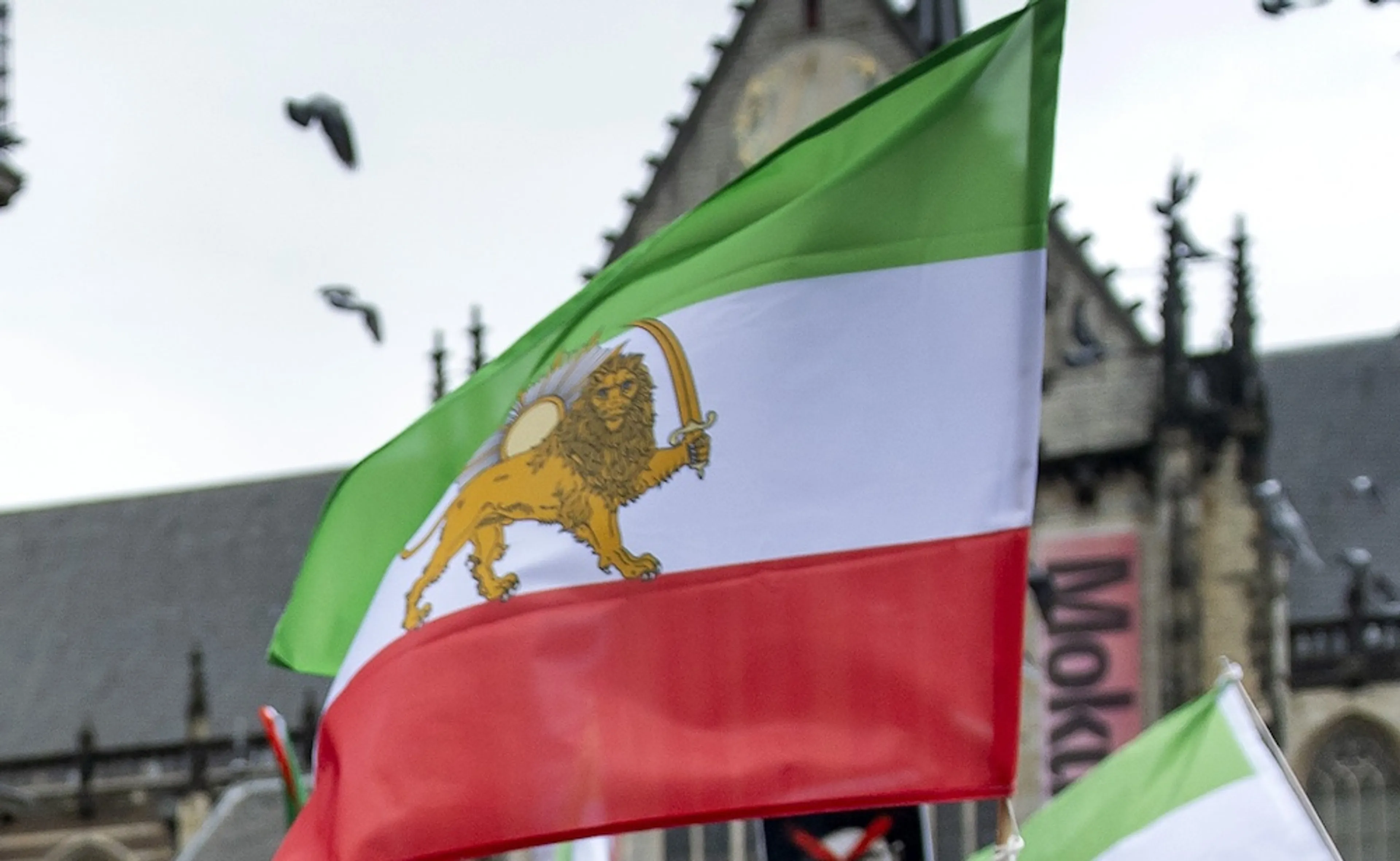 De Iraanse vlag zoals hij ten tijde van het bewind van de sjah werd gevoerd. Deze staat nu symbool voor de vrijheidsstrijd.