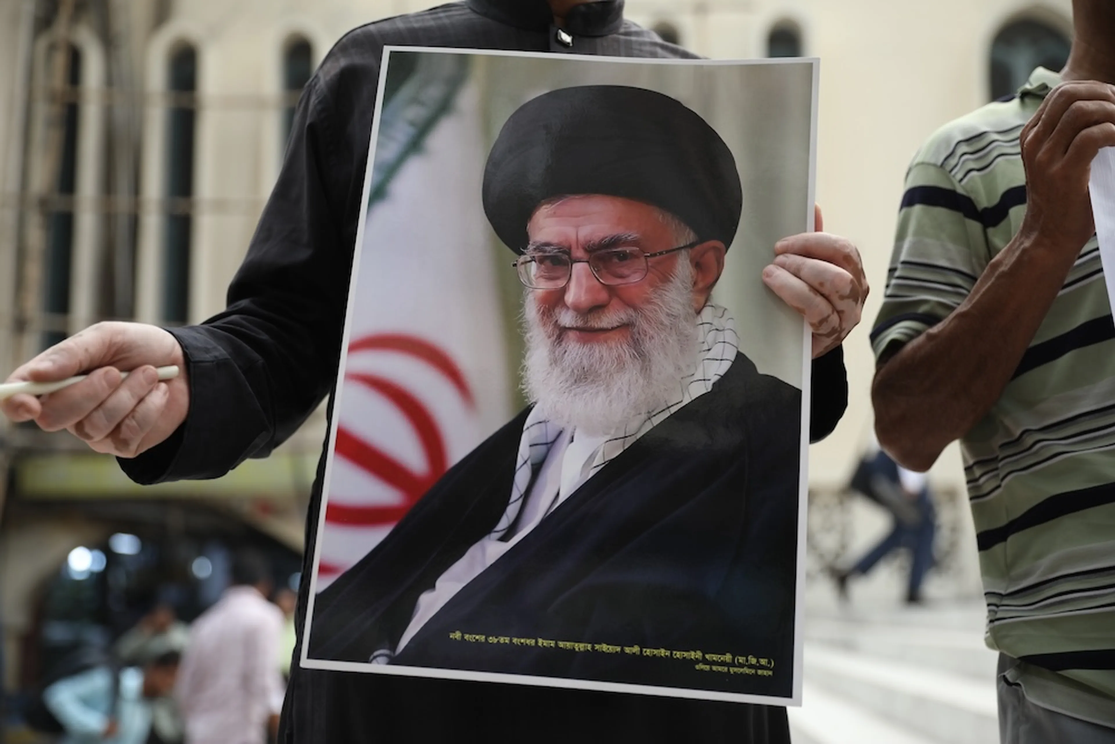 Portret van ayatollah Ali Khamenei die afgelopen weekend is gedood bij aanvallen van de VS en Israël.
