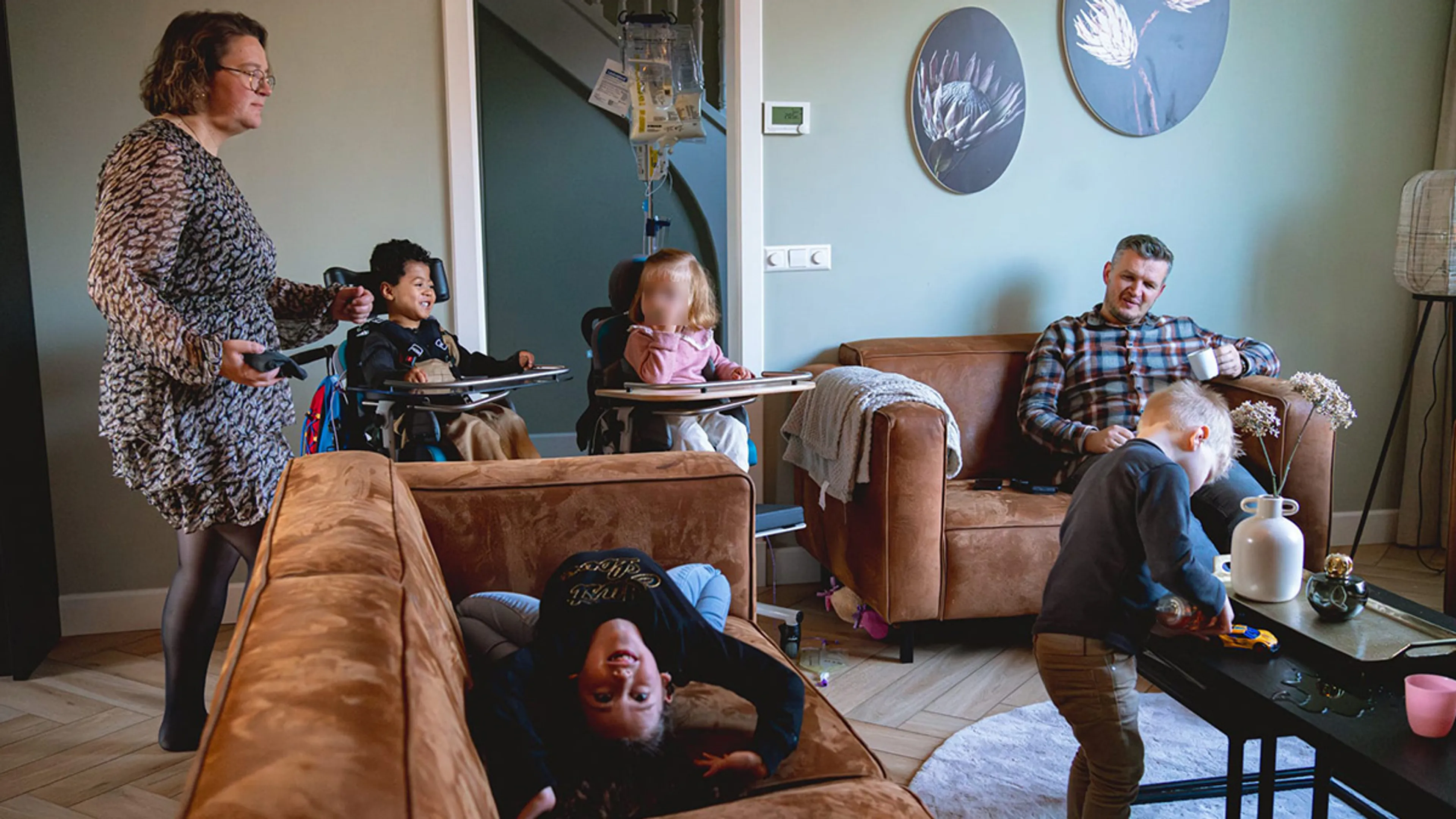 Ondanks het feit dat Petrineke wekelijks afspreken langs moet bij fysiotherapeuten, verschillende scholen, artsen, biologische ouders en jeugdbeschermers, ervaart ze het niet als druk. “Mijn man en ik zijn fulltime bezig met zorgen en ons leven is rijk en vol, maar het voelt hier thuis eigenlijk gewoon ontspannen en het is meestal heel gezellig. Je moet wel flexibel kunnen zijn en niet te snel in de stress schieten”, lacht ze.